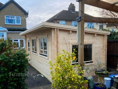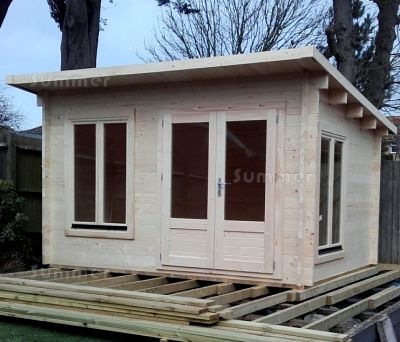 These high quality pent roof log cabins are available in sizes from 8'x11' to 13'x20' (2.5x3.3m to 4.0x6.0m) with a choice of 45mm logs or 140mm twinskin. The price includes premium double glazing, double hinged doors and a double opening front window with panoramic low level large pane glazing. Roof options include untearable roofing felt and a durable one piece EPDM rubber membrane. Other options include additional windows and floor and roof insulation. The great value price includes a heavy duty 19mm thick tongued and grooved floor. Detailed fitting instructions are supplied for DIY self assembly. Low cost installation is available in many areas.
