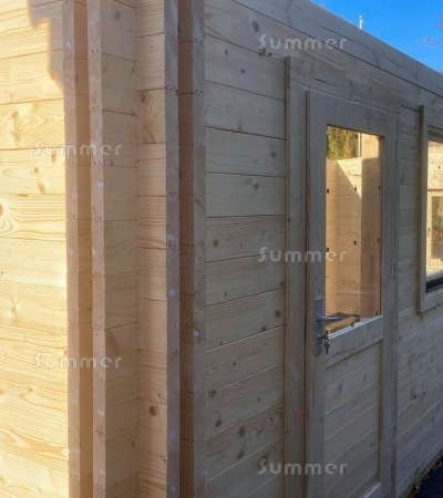 Pictures 1 and 2 show the standard 2.5x3.3m log cabin. Picture 3 shows a close up view of the doors. Pictures 4 and 5 show close up views of the windows (the windows provided with the cabin are bigger than the ones shown in the close up photos). Picture 6 shows a close up view of the twinskin corner construction. The videos show a number of the features of our log cabins - please note, some details may differ between buildings.