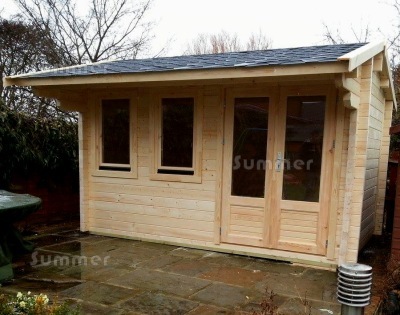 These high quality side door apex log cabins are approximately 10'x13', 10'x16', 10'x20', 13'x13' or 13'x16' (3.0x4.0m, 3.0x5.0m, 3.0x6.0m, 4.0x4.0m or 4.0x5.0m) with a choice of 45mm logs or 140mm twinskin. The price includes premium double glazing, double hinged doors in the side wall and two opening windows with large pane glazing. Roof options include untearable roofing felt, felt tiles, genuine cedar shingles and granular steel roof tiles. Other options include additional windows and floor and roof insulation. The great value price includes a heavy duty 19mm thick tongued and grooved floor. Detailed fitting instructions are supplied for DIY self assembly. Low cost installation is available in many areas.