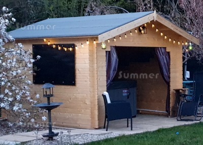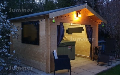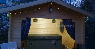 A HOT TUB COVER OR A GAZEBO: This log cabin can be used to cover or enclose a hot tub or spa. Smaller hot tubs will pass through the door opening. Larger hot tubs are positioned before the cabin is installed. There is enough space inside to comfortably accommodate even a large hot tub. This versatile cabin is also popular as a garden gazebo which can be used as a shady retreat in the summer or as a store for garden furniture and toys in winter.