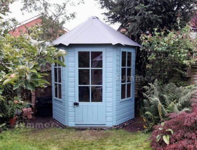 HEXAGONAL BUILDING SIZES: For ease of reference these hexagonal summerhouses are measured as a rectangle. The first dimension listed is the overall width from side to side and the second dimension is the depth from front to back. The overall width is measured at the widest point from corner to corner. The depth is measured at the narrowest point from wall centre to wall centre. Sizes are sometimes rounded to the nearest nominal size for ease of reading but the correct external wall sizes are listed alongside the price. These sizes do not include the roof overhang. Many other suppliers quote the overall roof size which is much larger. All sizes are approximate.