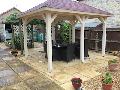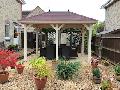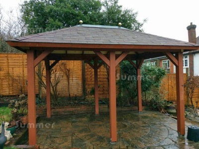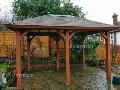 These quality wooden gazebos are available up to 20' (6.0m) wide and up to 14' (4.2m) deep. The sizes range from approximately 8'x8' to 14'x20'. Quality features include substantial 5"x5" posts (120x120mm). The hipped roof features heavy duty timber supports with 19mm thick tongued and grooved boards. The price includes decorative felt tiles in a choice of colours. A heavy duty timber floor is available as an option with durable larch decking boards. These luxury gazebos are ideal for use as a hot tub cover or smoking shelter. Instructions are supplied for self assembly. We offer fitting as a low cost option in many areas.