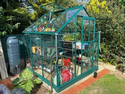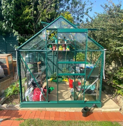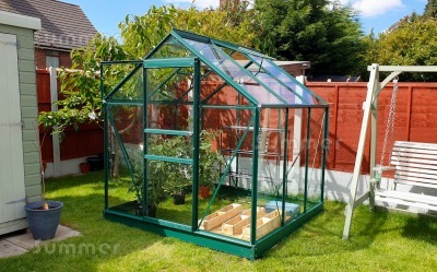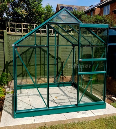 This unbeatable value greenhouse is approximately 6'x4', 6'x6', 6'x8' or 6'x10' with incredible prices for green finish with toughened glass. The strong and durable frames are green powder coated aluminium. Luxury features include a sliding door with handle and 2 free opening roof vents. The frame includes triple eaves corner plates for added strength. Extra braces and struts are also included for extra strength and rigidity. The door is in the 6'5" wide wall. A base plinth is also included, which makes installation easier. Detailed fitting instructions are supplied for DIY self assembly. Low cost installation is available in many areas.
